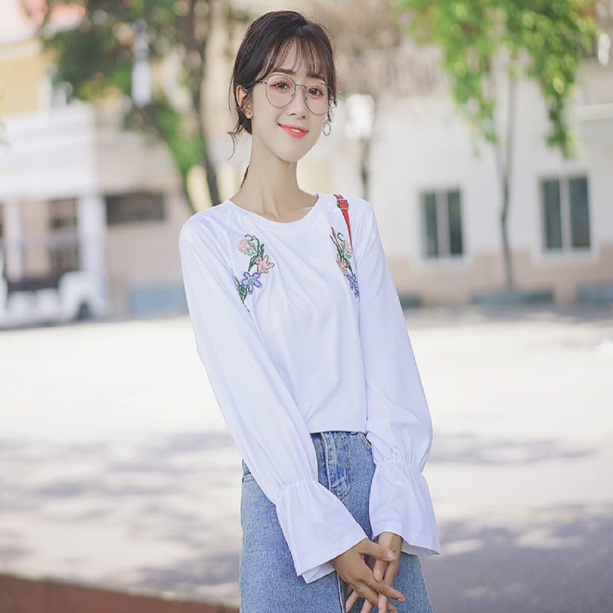 【送料無料】 花柄 刺繍 ブラウス シャツ 小花 可愛い ナチュラル シンプル 着回し 春 秋 植物 ホワイト お出かけ デート 通勤 通学 ラウンドネック 袖フレア TP-021KR