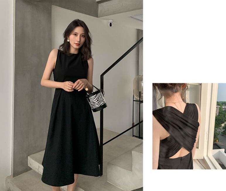 【送料無料】 バックシャン!!♡ブラックバッククロスワンピース 丸首 スリムフィット ノースリーブ ミディ丈 ウエストコンシャス エレガント シック 大人フェミニン 上品 レジャー 旅行 リゾート お呼ばれ お出かけ デート パーティー 二次会 OP-078KW