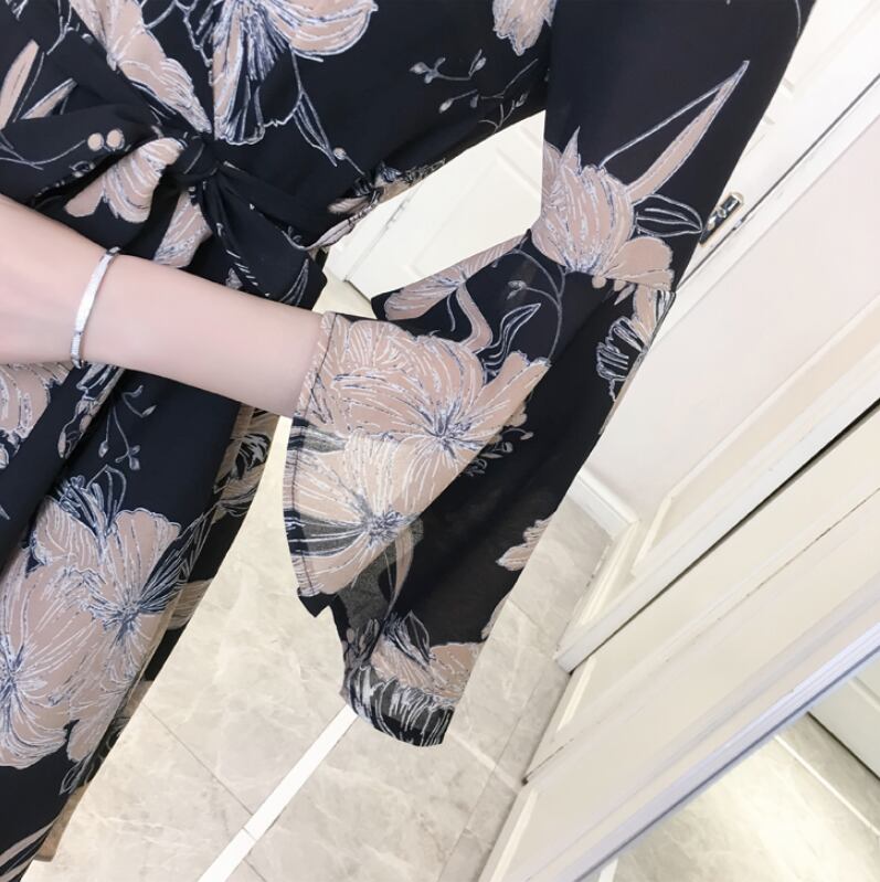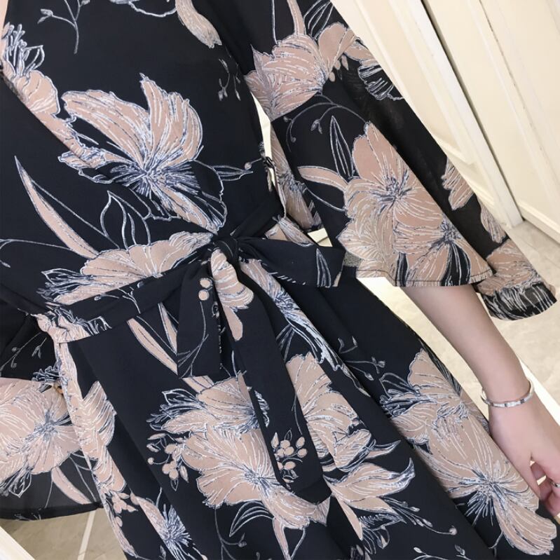 【送料無料】超エレガント♡カーブベル袖ブラックシフォンワンピース 韓国トレンド 大花柄 Vネック ハイウエスト ウエストリボン 七分袖 フレアスカート ひざ丈 スタイリッシュ 上品 大人フェミニン 清楚感 春夏 大き目サイズ L XL 2XL オフィス 通勤 通学 レジャー 旅行 リゾート 普段使い デイリー お呼ばれ お出かけ デート パーティー OP-085KW