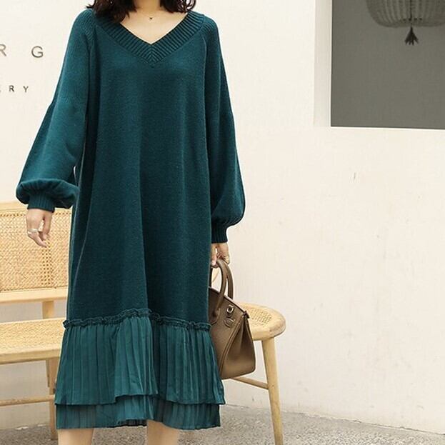 【送料無料】 ニットセーター ドレス ロングスカート Vネック 通勤 ルーズウエスト プリーツスカート OP-005AE