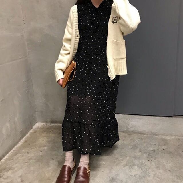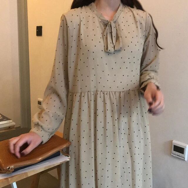 【送料無料】ロング ワンピース レトロ ボウタイ ドット柄 Aライン 上品 きれいめ シンプル ガーリー フェミニン お出かけ デート デイリー 春 OP-024IU