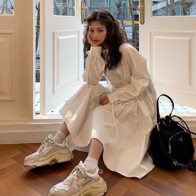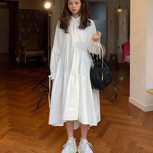 【送料無料】シャツ ロング ワンピース フィッシュテール ふんわり Aライン 大人可愛い ガーリー フェミニン きれいめ 無地 おしゃれ 上品 デート お出かけ デイリー 春 OP-028IU