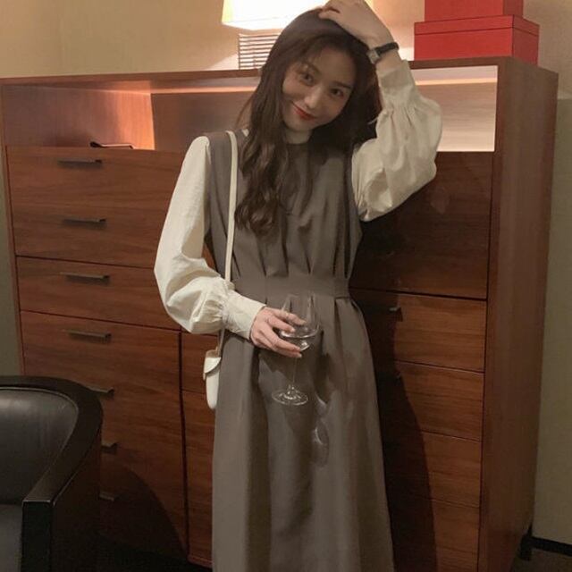 【送料無料】ジャンパースカート ワンピース タック ゆったり 体型カバー ハイウエスト フレア カジュアル ガーリー フェミニン シンプル レトロ 無地 デイリー 着回し 大人可愛い 春 OP-034IU