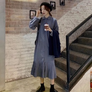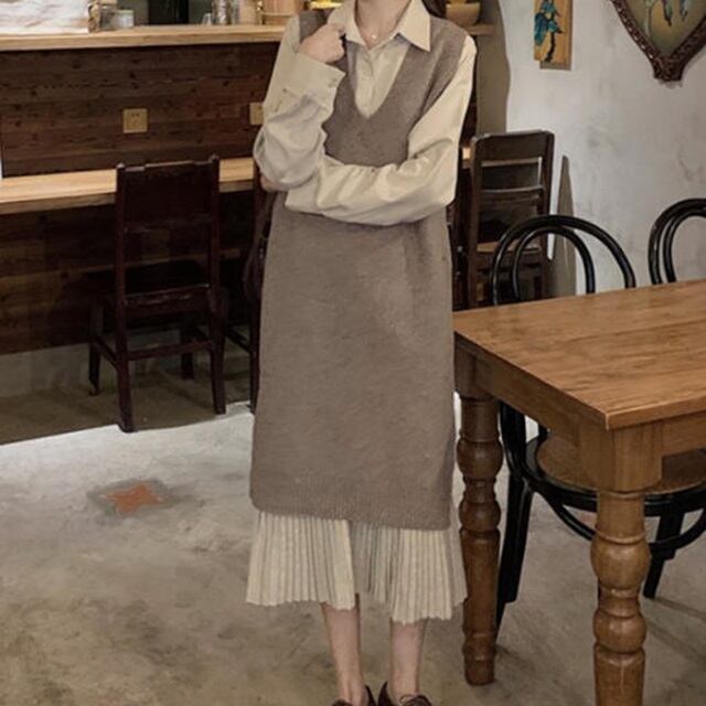 【送料無料】セットアップ シャツ ワンピース プリーツ裾 × ロング ニット ベスト 大人可愛い カジュアル ナチュラル ガーリー レトロ デート デイリー 着回し お出かけ 春 OP-035IU