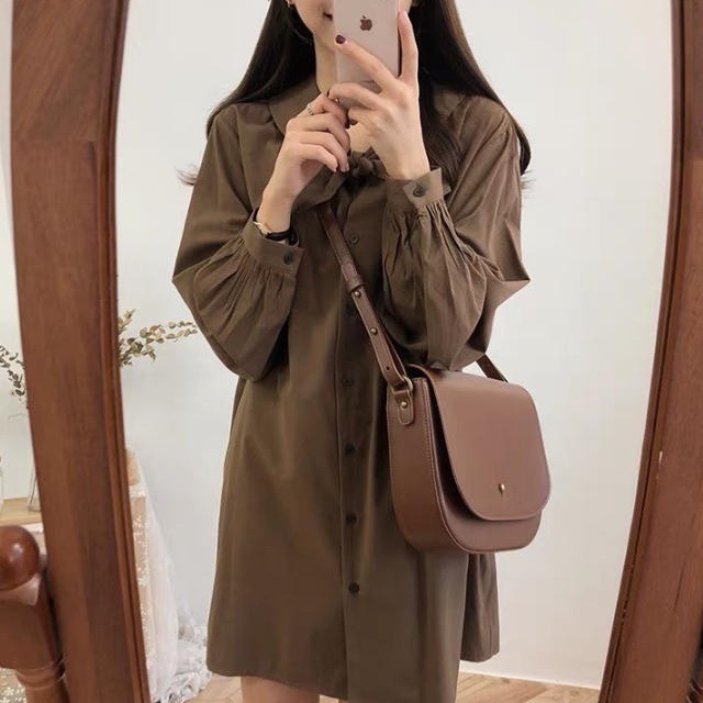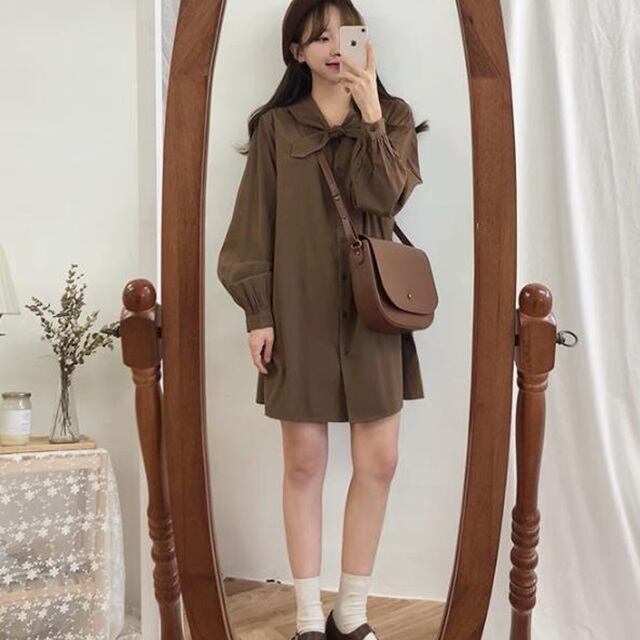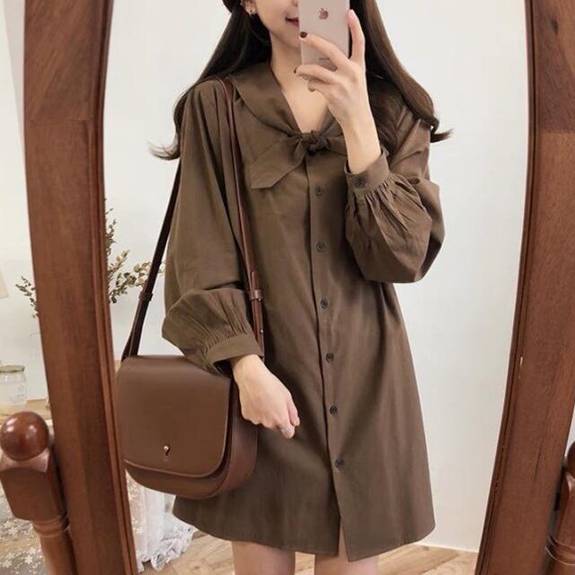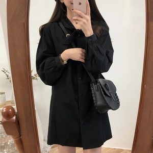 【送料無料】シャツ ワンピース リボンタイ ミニ丈 シンプル ボリューム袖 大きいサイズ 長袖 無地 パフスリーブ シンプル レトロ カジュアル ガーリー お出かけ デート デイリー 着回し 春 OP-042IU