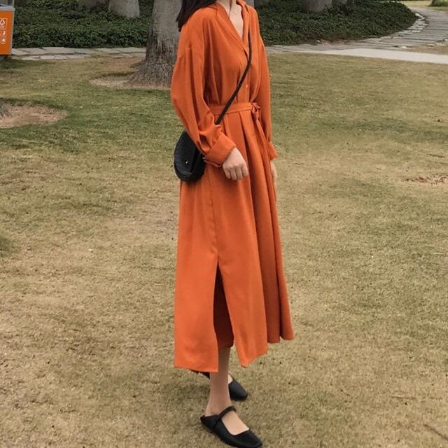 【送料無料】シャツ ワンピース 開襟 こなれ感 ロング丈 ウエストリボン フレンチ レトロ 長袖 カジュアル シンプル 無地 大人可愛い リゾート お出かけ デート 着回し デイリー 普段使い 春夏 OP-043IU