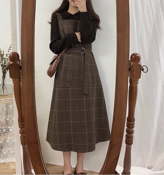 【送料無料】チェック ジャンパースカート ロング丈 スクエアカラー Aライン レトロ カジュアル ガーリー ハイウエスト リラックス レディース サロペット 体型カバー 2色 AI-005KI