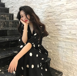 【送料無料】 ドット柄ワンピース ブラックドレス Vネック ミモレ丈 5分袖 パフ袖 スリムスタイル 韓国トレンド 大人フェミニン エレガント 上品 春夏 オフィス 通勤 通学 バカンス 旅行 リゾート 普段使い デイリー お出かけ デート OP-093KW