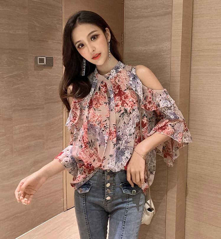 【送料無料】シフォンシャツ 花柄 オフショルダー 丸首 ネックギャザー フレア ドレープ 透け感 きれいめ スタイリッシュ 大人フェミニン エレガント 上品 セクシー オシャレ 春夏 ピンク ブルー 全2色 通勤 通学 レジャー 旅行 普段使い シティー デート お出かけ お呼ばれ 女子会 デイリー TP-171KW