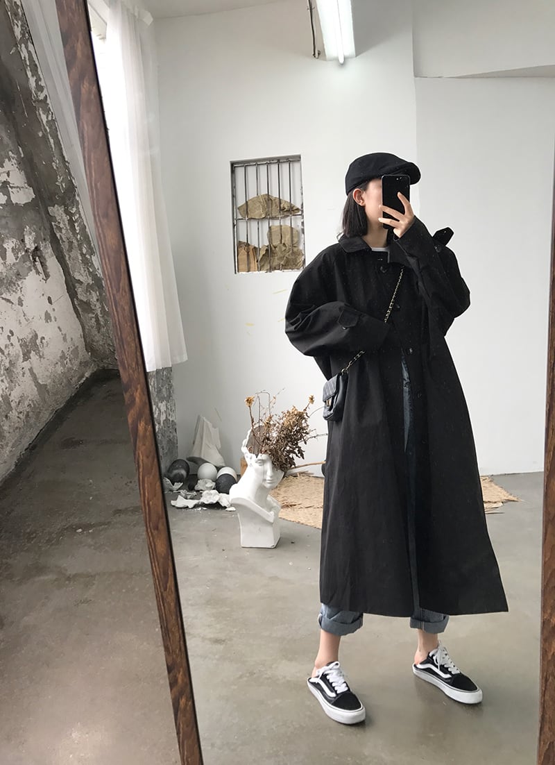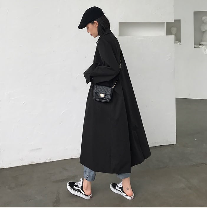 ゆったりシルエットながら広がりすぎず程よいラインのロングトレンチコート。