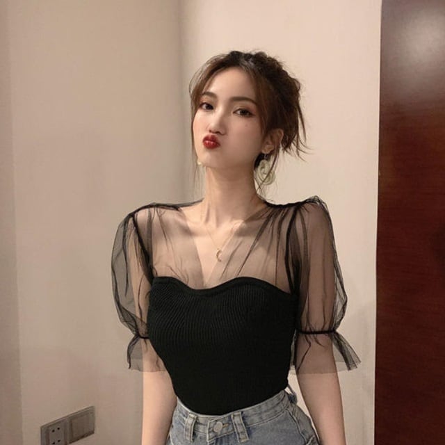 【送料無料】リブニット サマーニット メッシュステッチ シースルー Vネック トップス ブラウス キャンディスリーブ セクシー 透け感 大人可愛い お出かけ デート 女子会 エレガント キレイ目 着回し TP-092IU