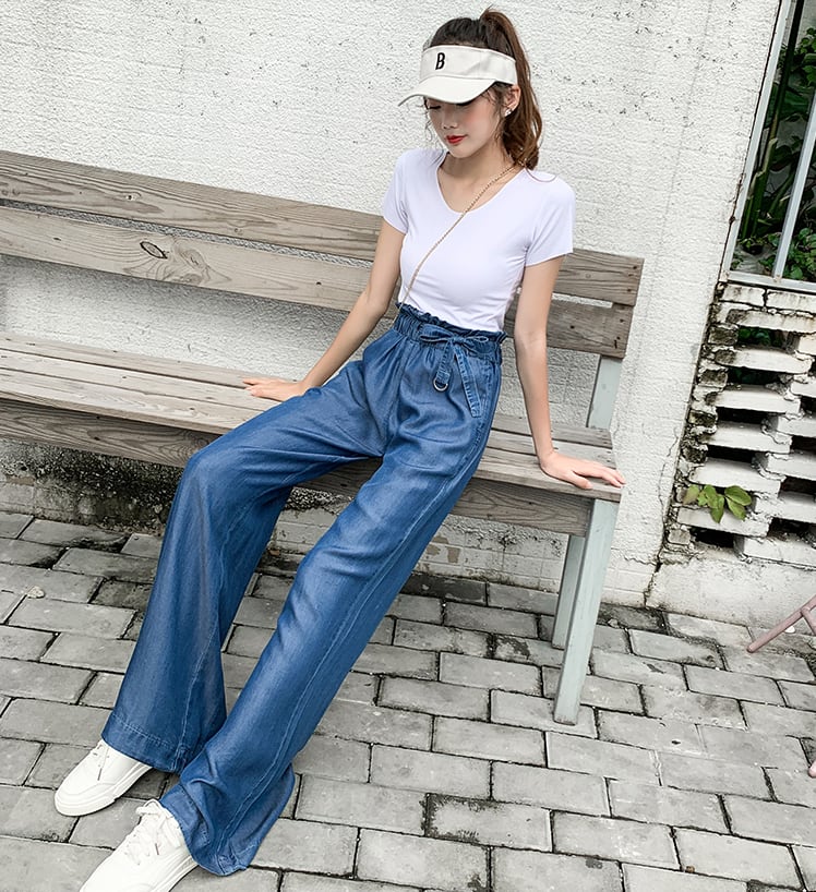 【送料無料】リヨセル デニムブルー ワイドパンツ フレア ベルボトム ハイウエスト ウエストゴム ウエストベルト ロング 柔らか スポーティ 大人カジュアル オシャレ 春夏 大きめサイズ L XL 2XL 3XL 通学 レジャー 旅行 普段使い シティー デイリー BM-027KW