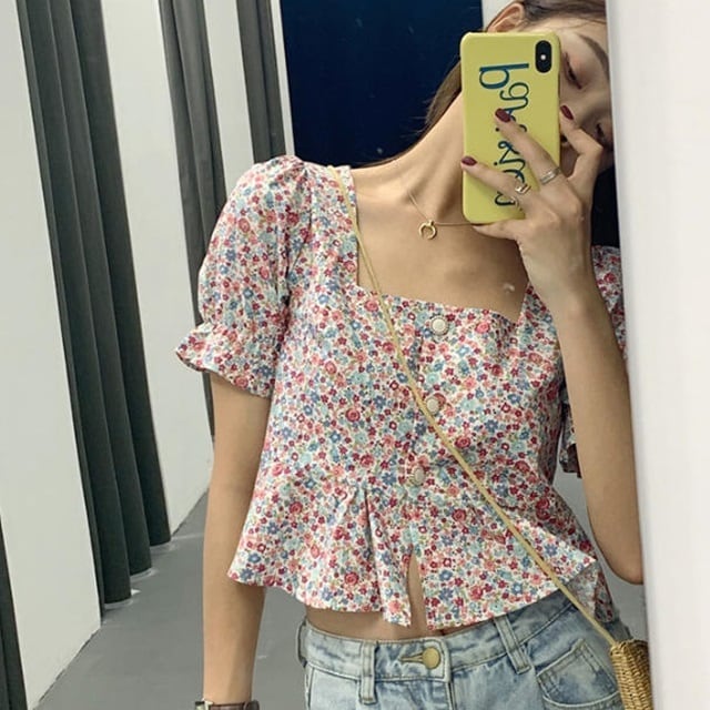 【送料無料】花柄 ブラウス トップス パフスリーブ フラワー ペプラム フリル パールボタン スクエアネック レトロ 大人可愛い フェミニン お出かけ デート 着回し デイリー 春夏 TP-104IU