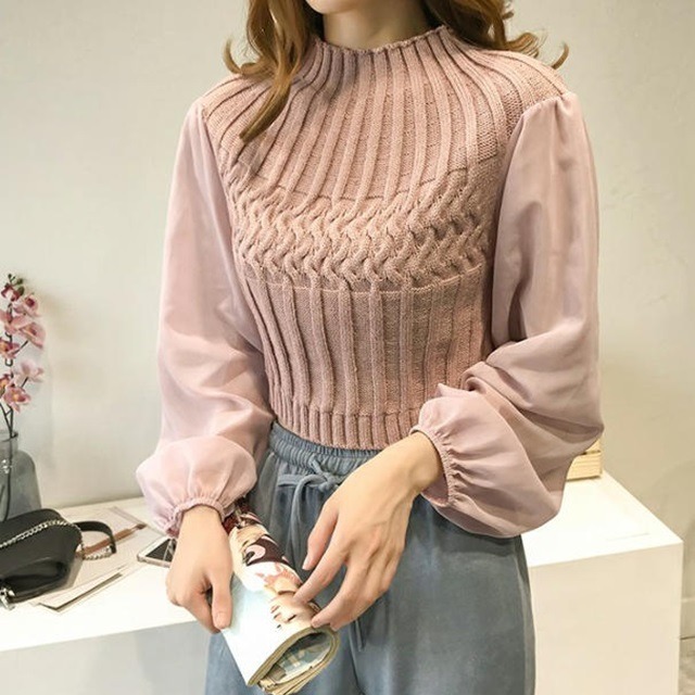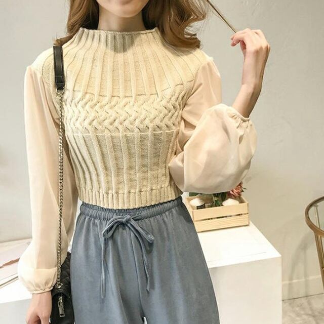 【送料無料】ニット トップス シフォン 透け感 スリム パフスリーブ ドッキング 異素材MIX ショート丈 大人可愛い キレイ目 上品 フェミニン ガーリーお出かけ デート デイリー 着回し TP-107IU