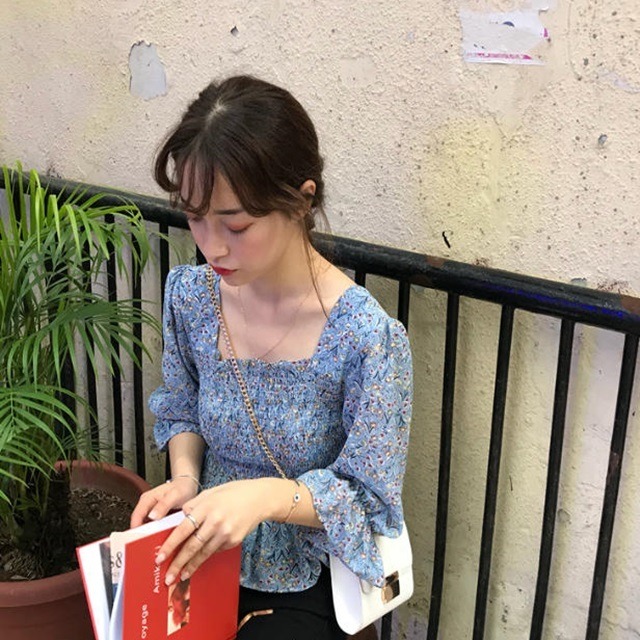 【送料無料】小花柄 シャーリング シャツ ブラウス トップス オフショルダー スクエアネック 2way 大人可愛い バッククロス バックンシャス カジュアル レトロ 大人可愛い フェミニン お出かけ デート 着回し デイリー 春夏 TP-108IU
