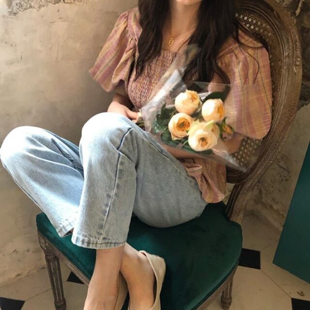 【送料無料】チェック柄 シフォン シャツ ブラウス トップス シャーリング ペプラム 半袖 パフスリーブ レトロ ガーリー フェミニン 大人可愛い カジュアル お出かけ デート デイリー 着回し 春 TP-109IU