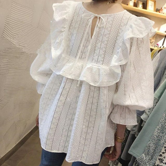 【送料無料】ブラウス シャツ トップス フリル レース キャンディースリーブ ホワイト 大きいサイズ おしゃれ レトロ フェミニン ナチュラル シンプル カジュアル ベーシック デイリー 着回し お出かけ デート TP-115IU
