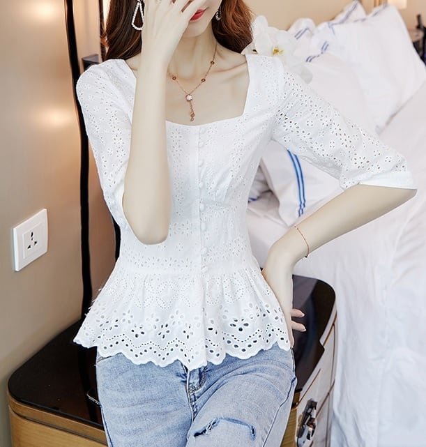 【送料無料】フラワーパンチングレース ショートブラウス バックリボン フリル コットン プルオーバー スクエアカラー ペプラム 体型カバー 春 夏 韓国 レディース 甘めシンプル ナチュラル フェミニン きれいめ 大人可愛い デイリー タウン リゾート 通学 同窓会 女子会 デート お出かけ S M L XL ホワイト TP-011KI
