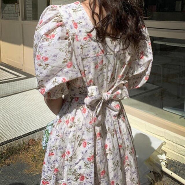 【送料無料】ワンピース 小花柄 パフスリーブ ロング バックリボン ハイウエスト フレア バックコンシャス クスエアネック 肌見せ 半袖 レトロ ガーリー フェミニン 大人可愛い ガーリー お出かけ デート 夏コーデ デイリー 着回し OP-064IU