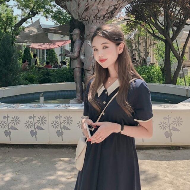 【送料無料】ワンピース ロング ミモレ丈 Vネック バイカラー 襟付き クラシカル フレンチ レトロ ハイウエスト 大きいサイズ 大人可愛い ガーリー 上品 清楚 フェミニン ガーリー お出かけ デート 女子会 デイリー 着回し OP-066IU