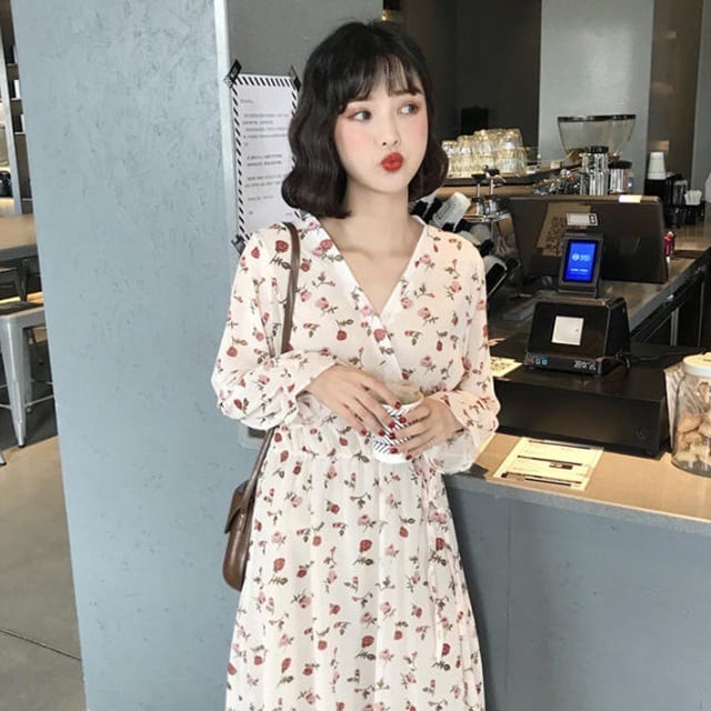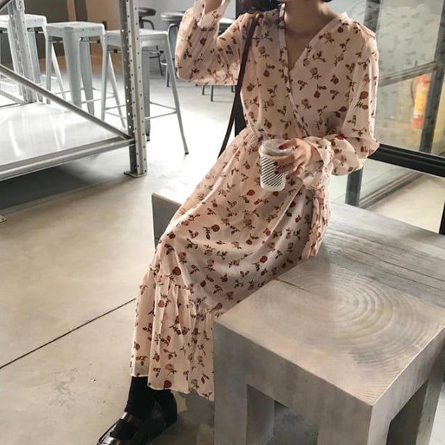 【送料無料】小花柄 カシュクール ワンピース ロング ミモレ丈 ゆったり Vネック シフォン フレア フリル ボリューム袖 キャンディースリーブ キレイ目上品 ナチュラル 春コーデ お出かけ デート デイリー 普段使い OP-072IU