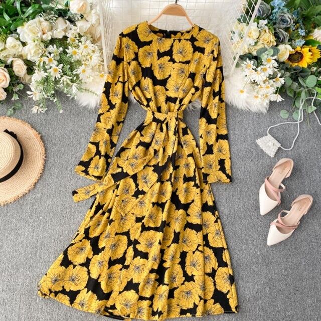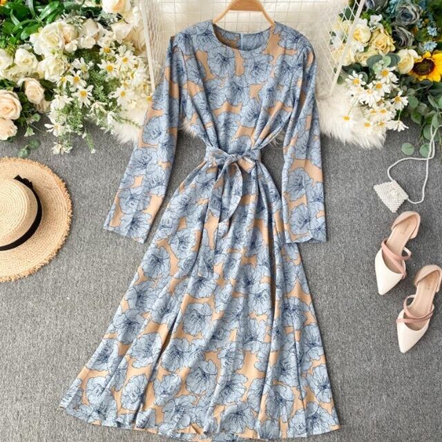 【送料無料】花柄 ワンピース ロング ミモレ丈 ヴィンテージ ラウンドネック ハイウエスト レトロ 大人可愛い エレガント キレイ目 上品 お出かけ デート 女子会 デイリー 普段使い お呼ばれ パーティ OP-088IU