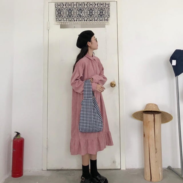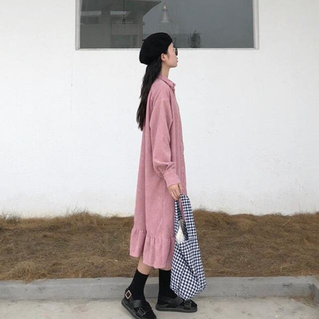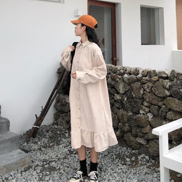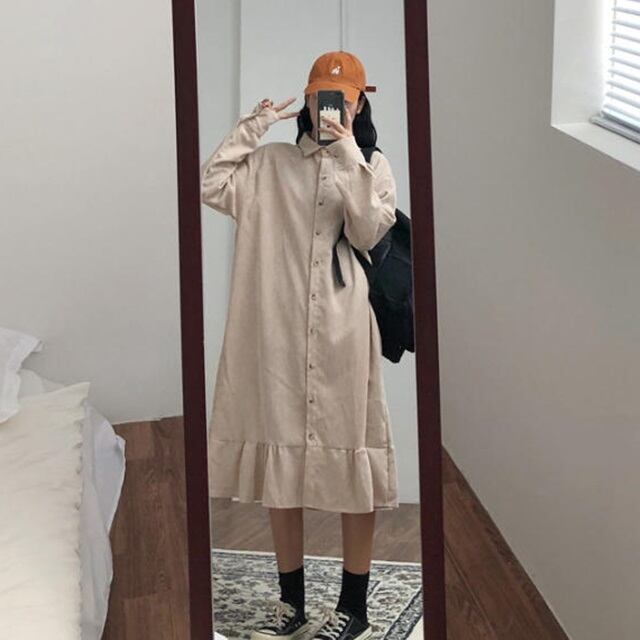 【送料無料】シャツワンピース ロング ミモレ丈 裾フリル フレア ゆったり 体型カバー ビッグシルエット カジュアル ガーリー 大人可愛い ベーシック シンプル お出かけ デート 着回し デイリー 普段使い OP-089IU