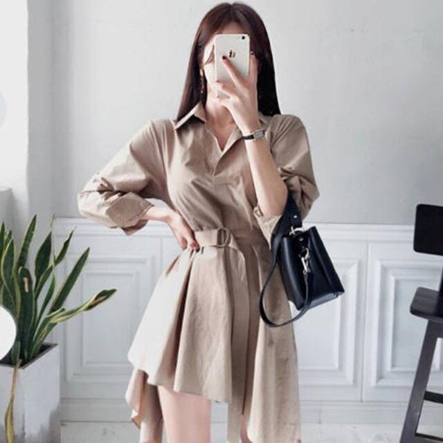 【送料無料】シャツワンピース ワンピ ミニ丈 ショート丈 アシンメトリー アンバランス ハイウエスト ウエストマーク こなれ感 大人可愛い カジュアル ゆったり 上品 キレイ目 おしゃれ お出かけ デート デイリー 着回し OP-091IU