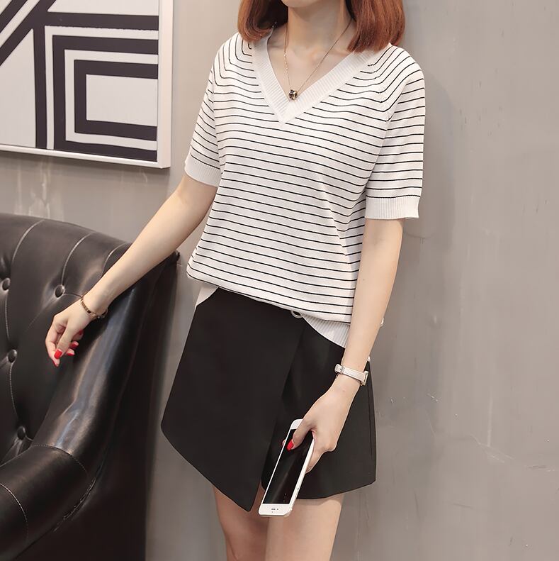 【送料無料】トップス ニット Vネック ストライプ サマーニット Tシャツ ボーダー 大人女子 キュート オシャレ カジュアル ガーリー TP-043AU