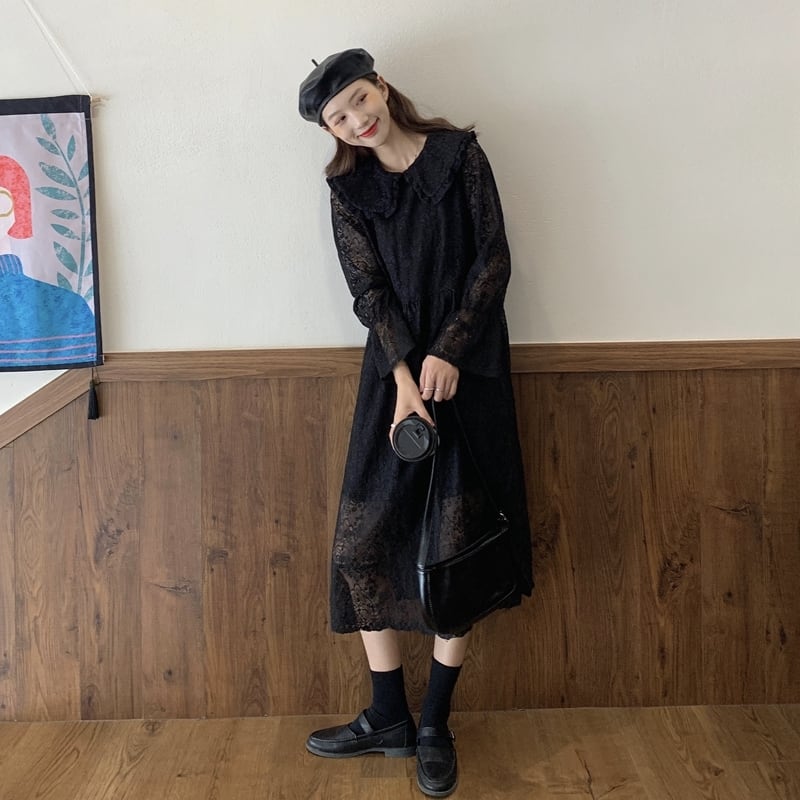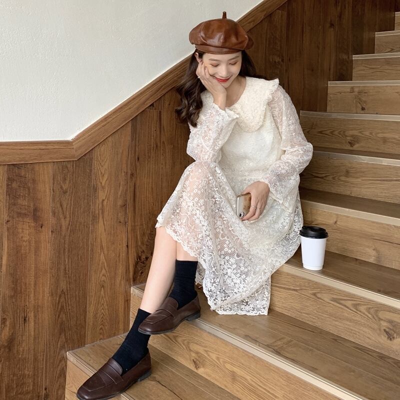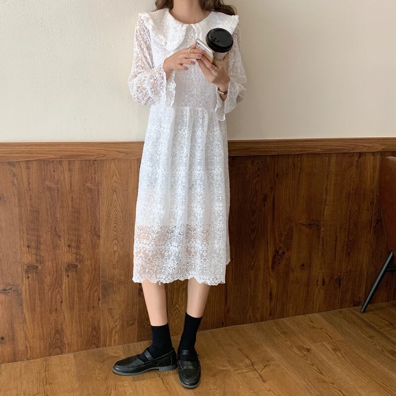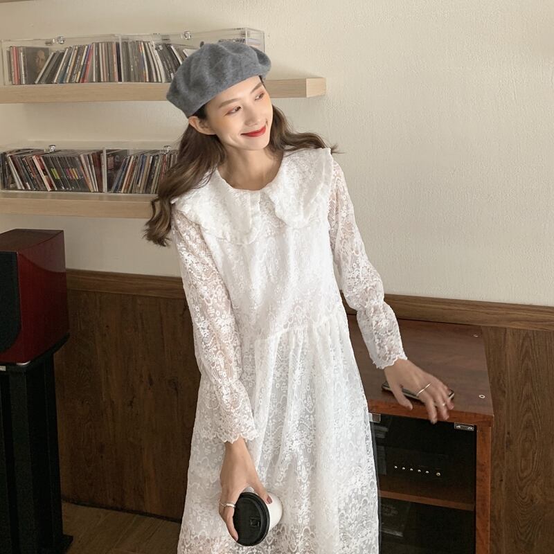 【送料無料】きれいめ レースワンピース ロング丈 長袖 春 秋 コットン レディース 韓国 ガーリー ナチュラル フェミニン 大人可愛い 甘め レトロ 体型カバー デイリー タウン リゾート 通学 女子会 デート お出かけ フリーサイズ ホワイト ブラック アプリコット 3色 OP-042KI