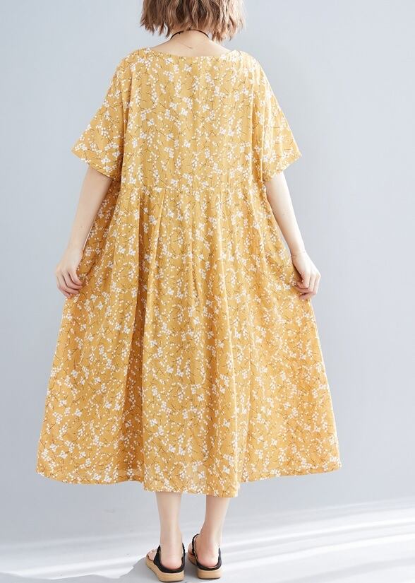 【送料無料】ゆったり花柄ワンピース マキシ丈 ロング丈 フレア ルーズウエスト 半袖 コットン 夏 レディース マタニティ 大きめ 体型カバー シンプル カジュアル ナチュラル デイリー タウン リゾート お出かけ ワンサイズ イエロー OP-046KI