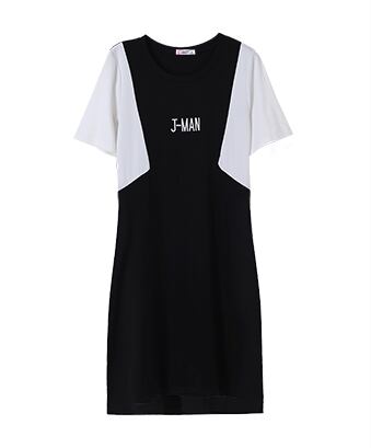 白のTシャツと黒のジャンパースカートのツーピースの様な、ユニークなTシャツワンピース♡ 半袖のゆるスタイルは春から夏にかけての太陽の日差しにぴったり★ 個性的なシャツワンピで街の視線も釘付けです☆