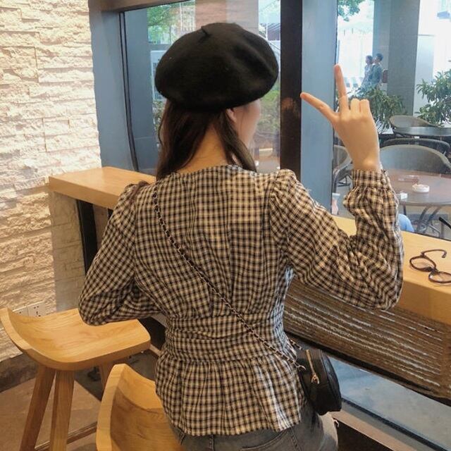 【送料無料】ギンガムチェック ブラウス トップス Vネック ペプラム フレア 体型カバー 着痩せ 大人可愛い フェミニン きれいめ レトロ カジュアル ガーリー お出かけ デート シンプル デイリー 着回し TP-138IU
