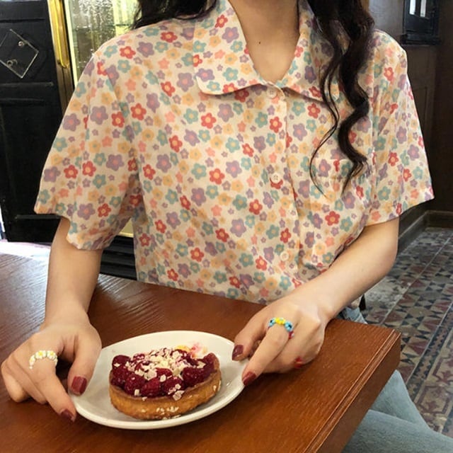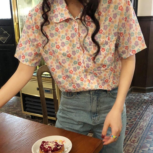 【送料無料】花柄 シャツ ブラウス トップス 胸ポケット 襟付き 夏コーデ カジュアル 半袖 ゆったり レトロ おしゃれ パステルカラー フェミニン ガーリー 大人可愛い 個性的 お出かけ デート 普段使い 着回し デイリー TP-151IU