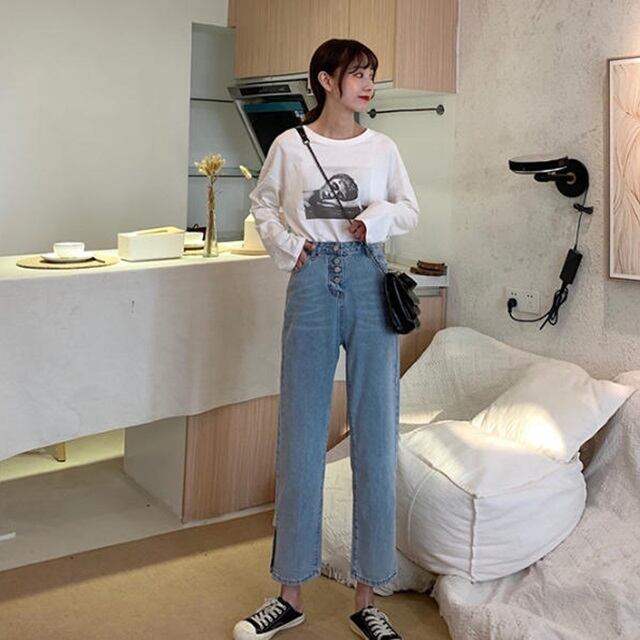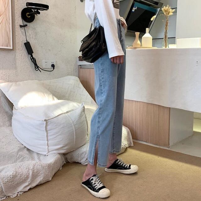 【送料無料】デニムパンツ ロングパンツ ストレート ハイウエスト フロントボタン アンクル丈 サイドスリット カジュアル 大人可愛い ベーシック シンプル 普段使い 学生 通学 おしゃれ デイリー 着回し BM-026IU