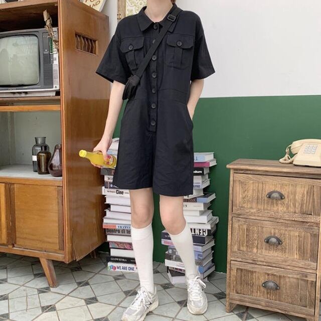 【送料無料】オールインワン コンビネゾン ロンパース ジャンプスーツ ワイドシルエット フロントボタン ゆったり 半袖 無地 カジュアル 大人可愛い シンプル ベーシック お出かけ デート デイリー 普段使い 着まわし ラフコーデ 夏コーデ AI-009IU