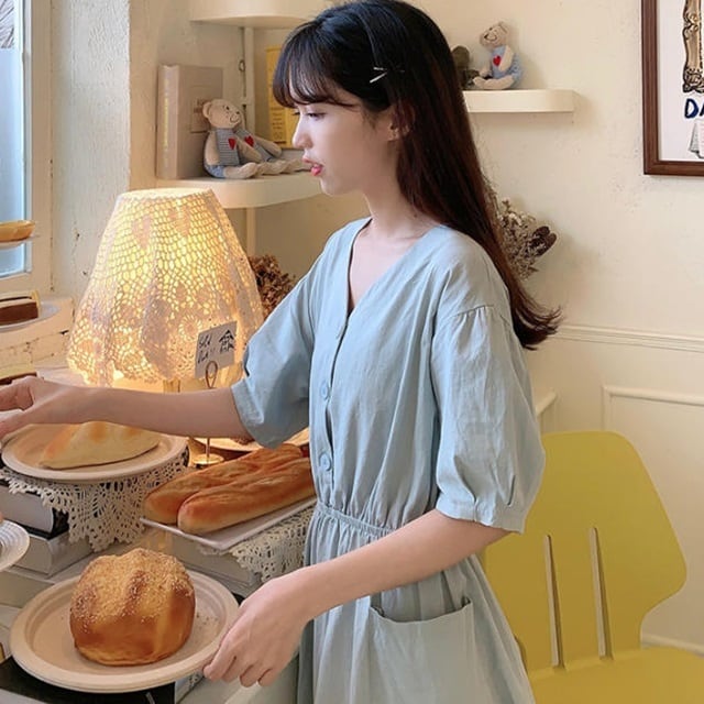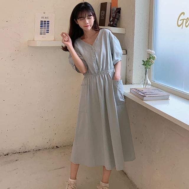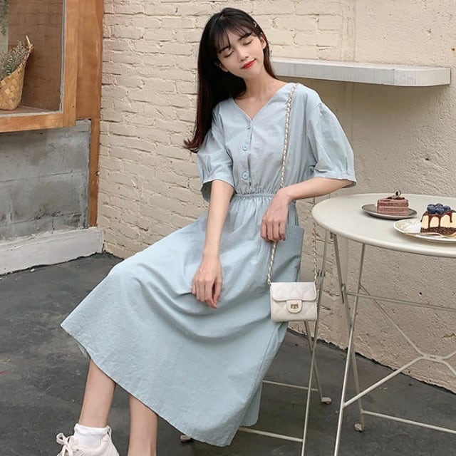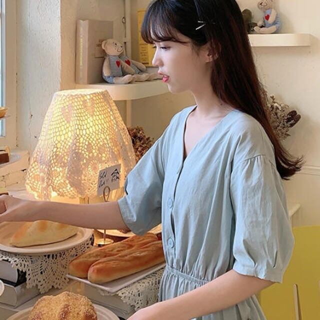 【送料無料】ワンピース ロング Vネック ハイウエスト リボン バックコンシャス パステルカラー ゆったり フレア Aラインシルエット カジュアル ナチュラル レトロ 大人可愛い シンプル ベーシック 無地 お出かけ デート 普段使い デイリー OP-119IU