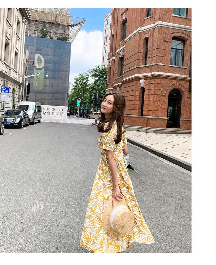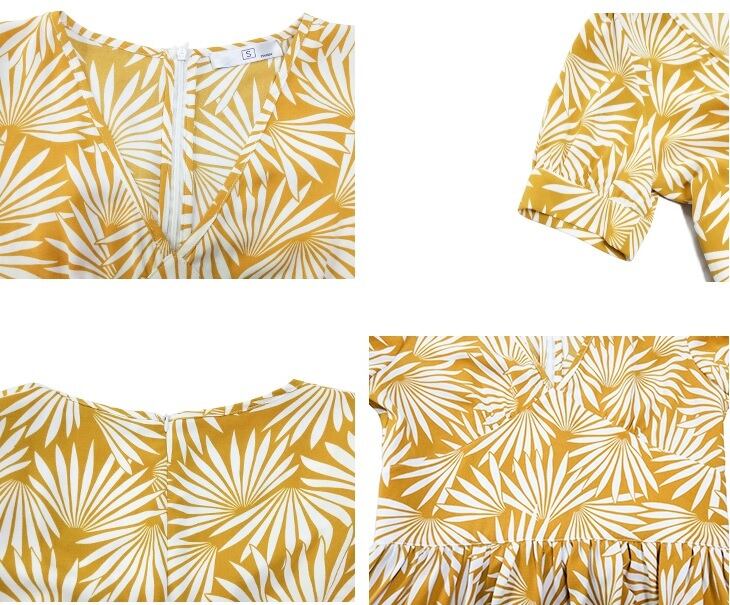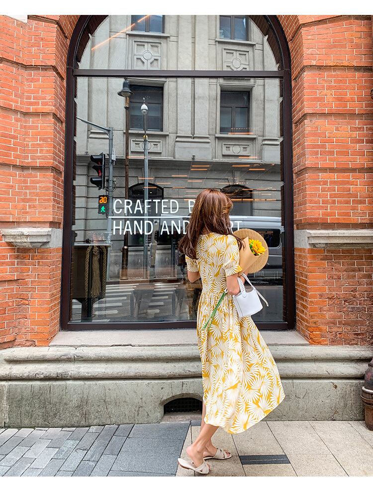 【送料無料】プリント ワンピース ロング丈 シフォン フレア ハイウエスト Vネック 半袖 パフスリーブ 夏 レディース ナチュラル カジュアル シンプル フェミニン きれいめ 大人可愛い デイリー タウン リゾート 通学 女子会 デート お出かけ S M L イエロー OP-071KI