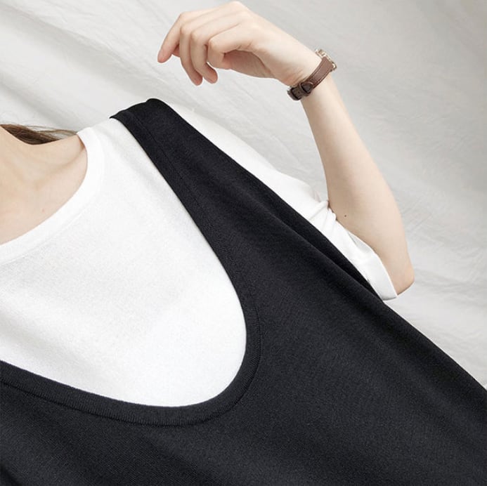 ブラック無地のUネックジャンパースカートと半袖Tシャツのセットアップ全2色です♡ すとんと落ちたゆるシルエットのジャンパースカートでゆったり◎ Tシャツはホワイトと来スカラーから選べます☆ 無地だから、自在にトップスとのコーデが春夏秋と楽しめる、便利なアイテムです♬