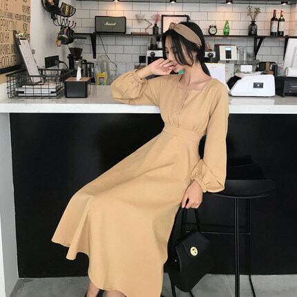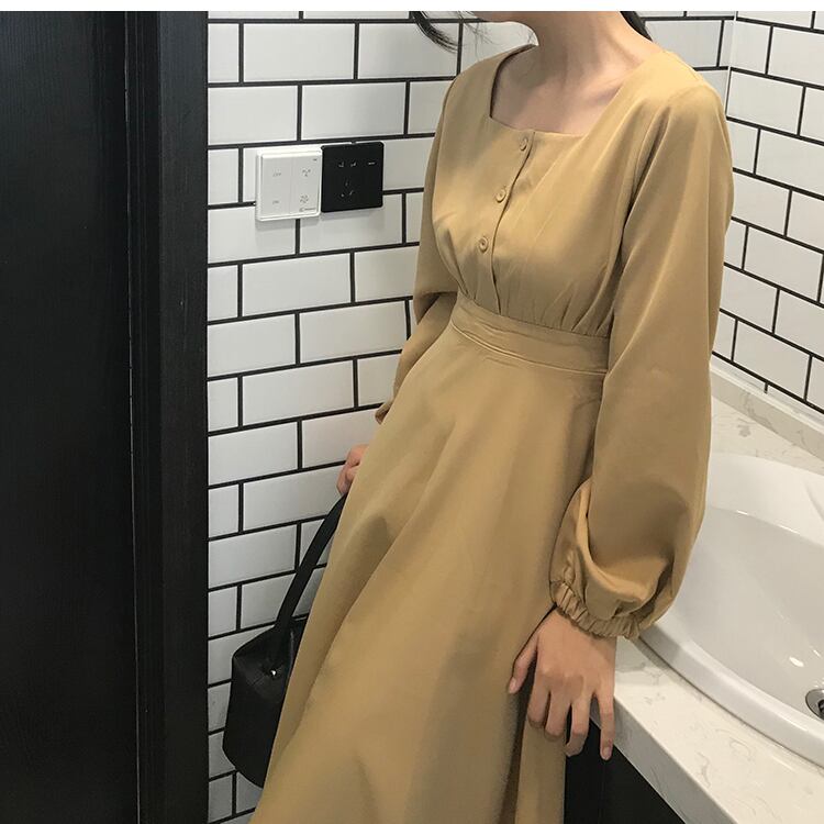 【送料無料】上品 ロングワンピース 春 秋 スクエアカラー レディース Aライン ハイウエスト ランタンスリーブ 無地 長袖 ベーシック トレンド感 シンプル ナチュラル フェミニン きれいめ タウン セミフォーマル 同窓会 発表会 女子会 デート お出かけ S M L XL レッド ブラック カーキ 3色 OP-080KI