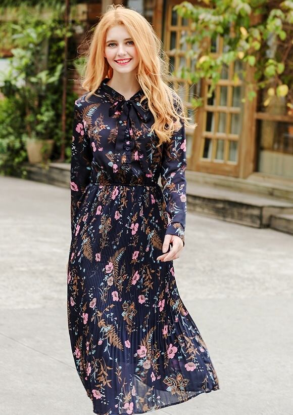 【送料無料】花柄ロングワンピース プリーツ ボウタイリボン フローラル レディース 長袖 シフォン 大きめサイズ サイズ豊富 大人可愛い 大人フェミニン トレンド感 デイリー タウン リゾート 通勤 通学 同窓会 女子会 デート お出かけ S M L XL 2XL ワンカラー OP-084KI
