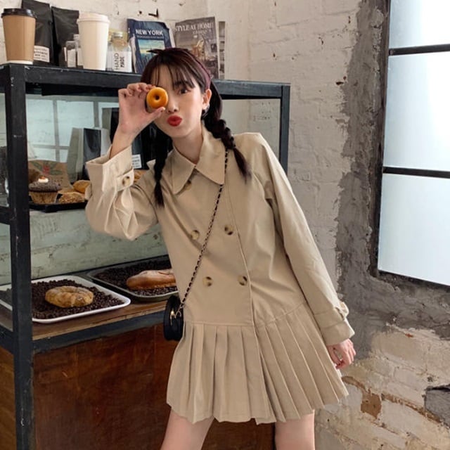 【送料無料】ステンカラージャケット トレンチ風 春コート アウター プリーツ 大人可愛い ゆったり 無地 おしゃれ カジュアル レトロ ガーリー お出かけ デート 通学 学生 普段使い デイリー 着回し OT-119IU