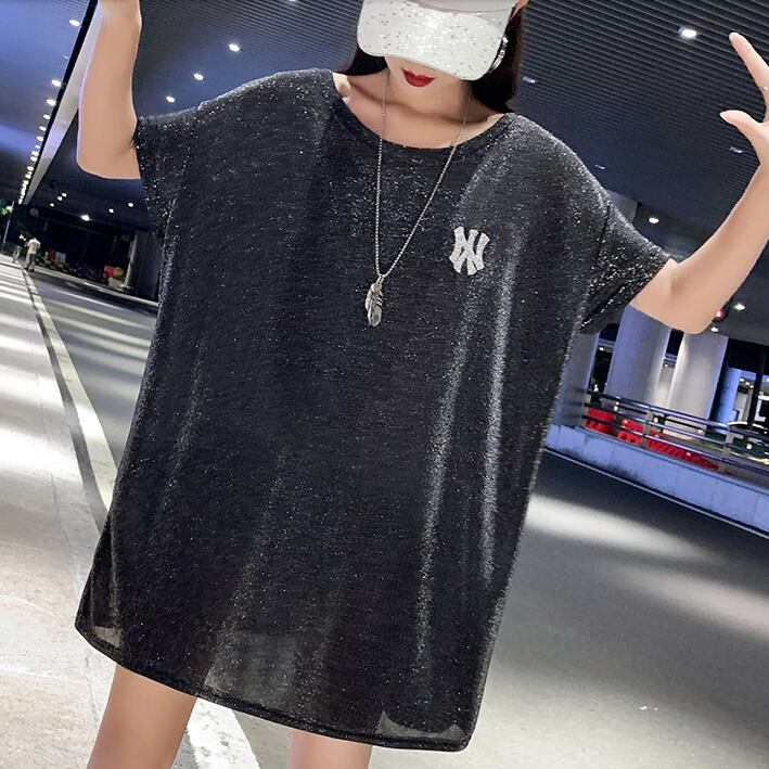 【送料無料】光沢ブラック ゆるTシャツ エンブレム 透け感 シースルー 半袖 丸首 韓国トレンド カットソー ゆるカジ ルーズフィット プルオーバー 大人カジュアル ベーシック シンプル オシャレ 春夏 通学 レジャー スポーティ 旅行 普段使い シティー お出かけ 着回し デイリー TS-012KW