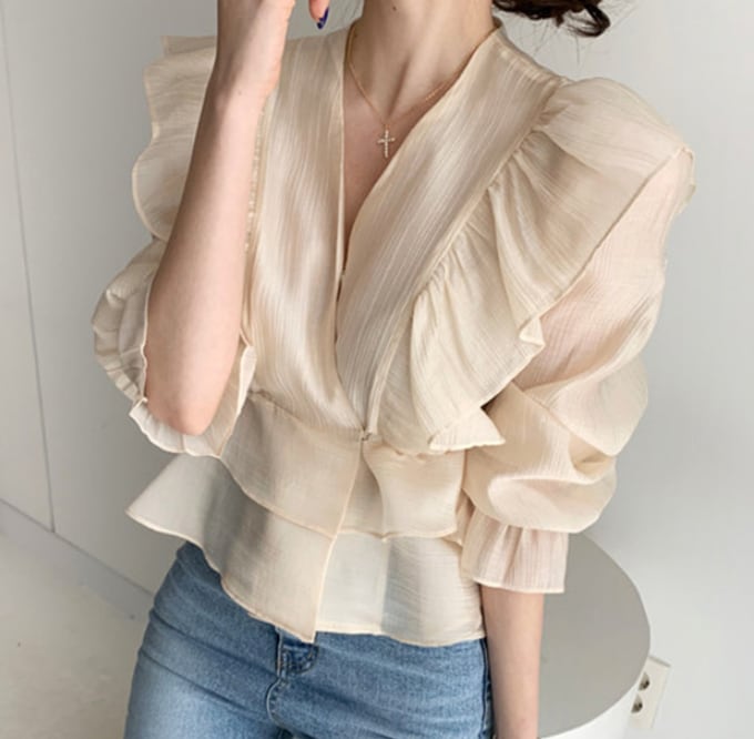 【送料無料】アプリコット トップス ブラウス Vネック フリル シフォン テクスチャー 透け感 スタイリッシュ 韓国トレンド 無地 長袖 パフ袖 セクシー 大人フェミニン オフィス 通勤 通学 カジュアル 普段使い シティー デート お出かけ デイリー SH-010KW