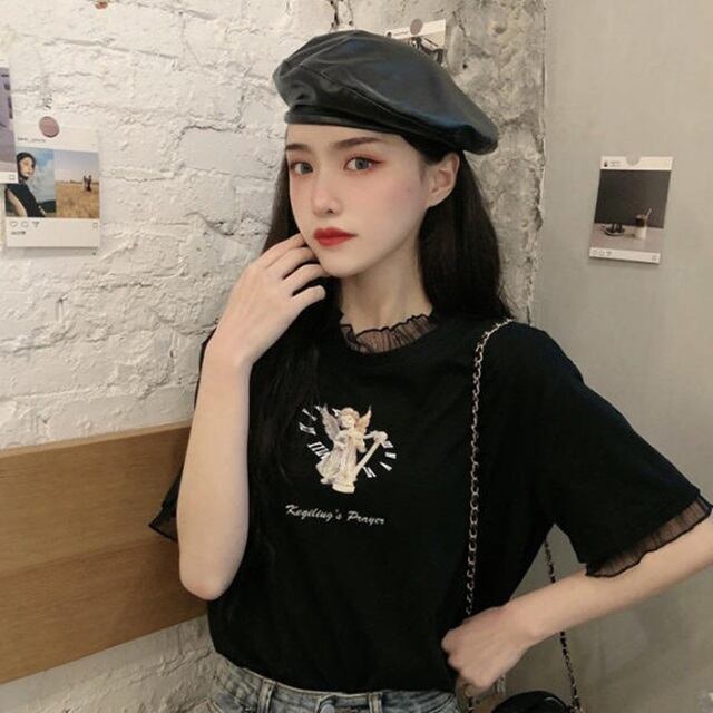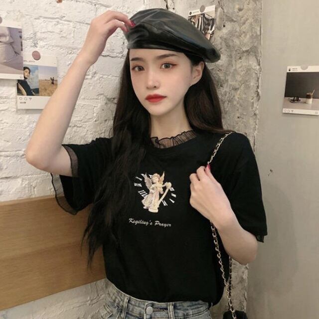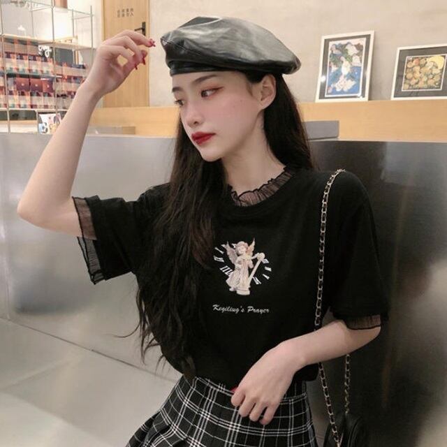 【送料無料】Tシャツ プリントTシャツ トップス 天使 レース ロゴ 英字 半袖 ゆったり レトロ 大人可愛い ガーリー フェミニン お出かけ デート 普段使い 着回し デイリー TP-189IU