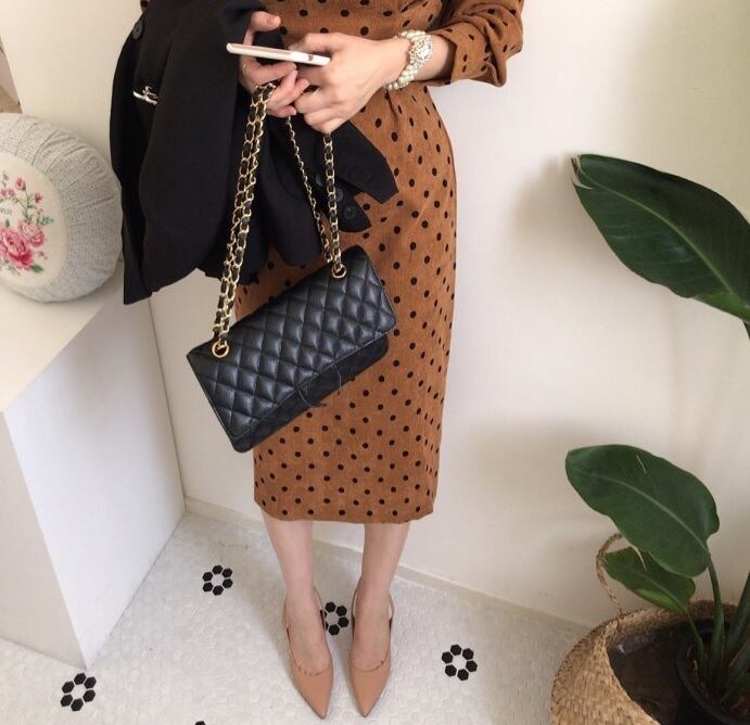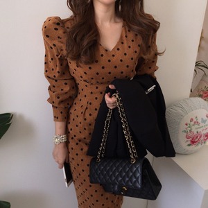 【送料無料】ドットワンピース Vネック 後ろリボン ロング丈 Vネック コーデュロイ ハイウエスト パフスリーブ レディース キレイめ レトロ 大人フェミニン ラブリー ガーリー 大人可愛い 通勤 通学 デイリー 普段使い セミフォーマル タウン 休日 お出かけ 女子会 デート アプリコット ブラウン 2色 OP-095KI
