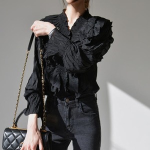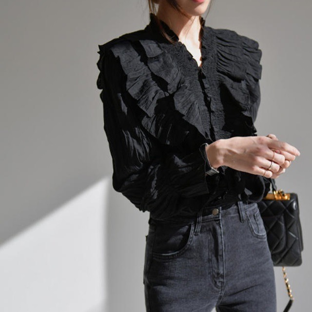 【送料無料】ブラウス シャツ トップス シフォン Vネック フリル 無地 長袖 ゆったり レトロ フェミニン 大人可愛い お出かけ デート 着回し デイリー 普段使い 女子会 TP-211IU