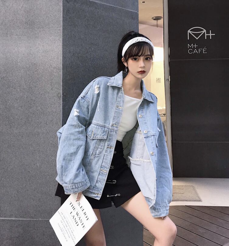 【送料無料】デニムジャケット ダメージド ライトブルー Gジャン ポロ襟 ゆるカジ フラップポケット 韓国トレンド 大人カジュアル スタイリッシュ アウター 春秋 通学 デイリー お出かけ デート 女子会 普段使い OT-142KW