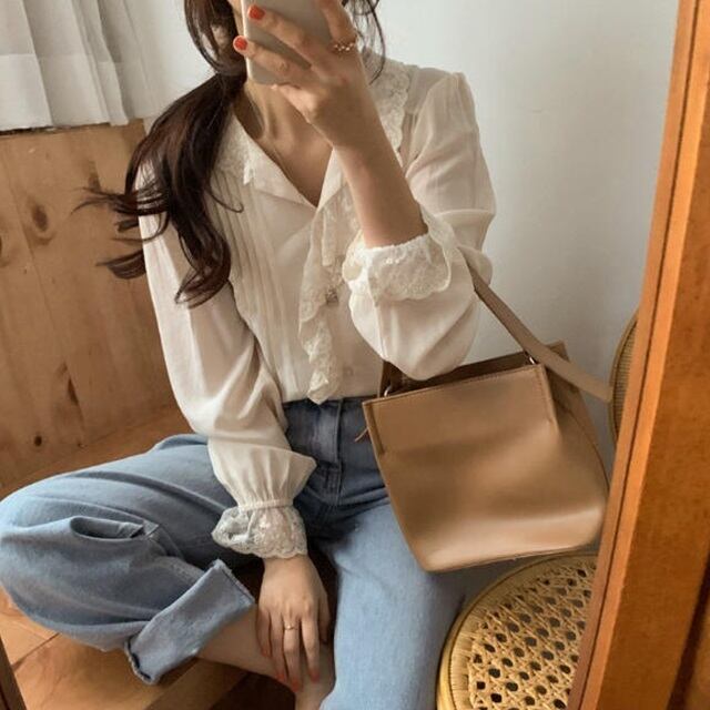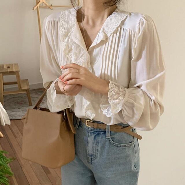 【送料無料】ブラウス シャツ トップス Vネック レース ナチュラル シンプル おしゃれ 長袖 ゆったり ガーリー フェミニン レトロ 大人可愛い お出かけ デート 普段使い デイリー 着回し TP-217IU