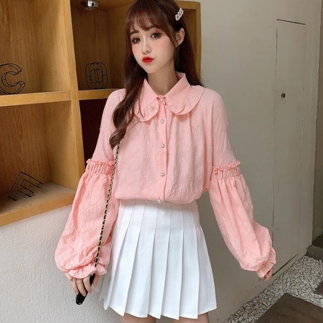 【送料無料】ブラウス シャツ トップス 丸襟 フリル ギャザー ボリューム袖 長袖 ゆったり カジュアル シンプル おしゃれ 大人可愛い デイリー 着回し 普段使い TP-218IU
